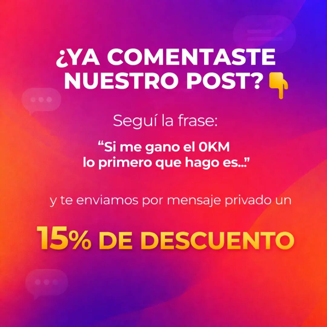 Para los que se suman a participar… hay beneficio. Comentá en el posteo que subimos en nuestro perfil de Instagram "Si me gano el 0KM lo primero que hago es…" y obtené un 15% de descuento para usar en tu próxima compra. Además, entre todos los comentarios vamos a elegir uno que se lleva un 50% OFF.